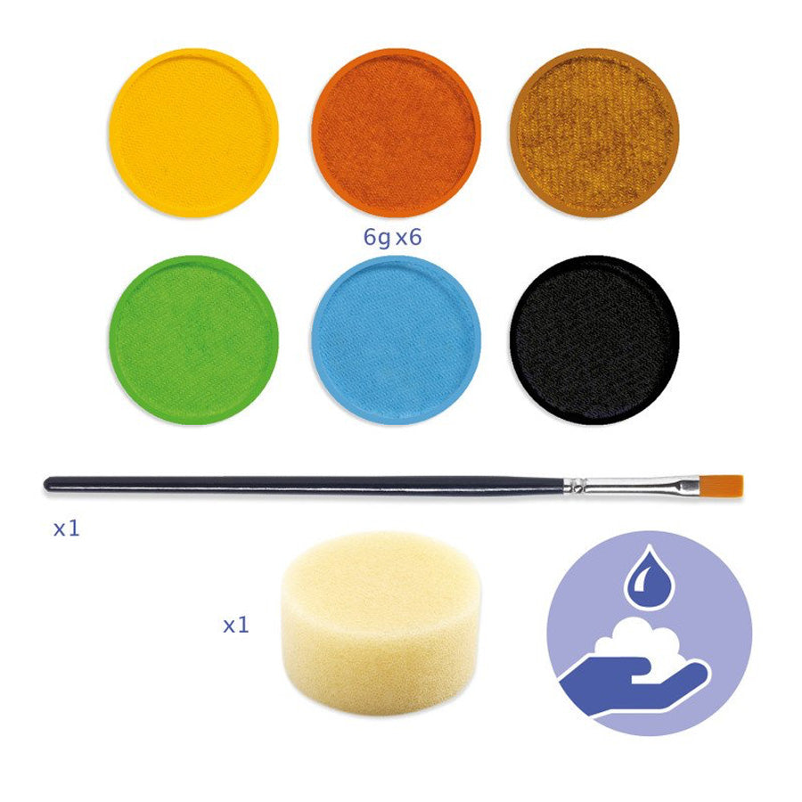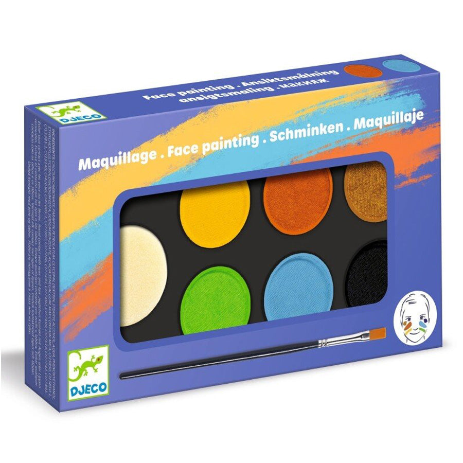 Gør klar til fastelavn eller rolleleg med denne palette fra Djeco. Indeholder seks dækkende naturfarver, pensel og svamp. Skånsom mod huden og nem at vaske af.