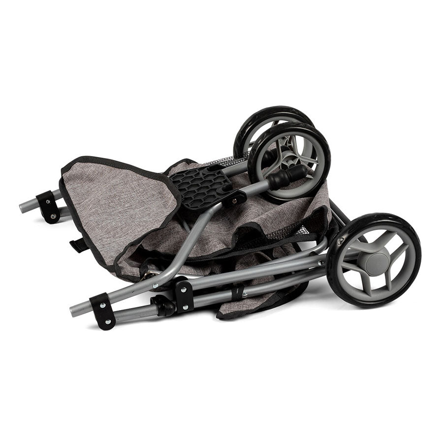 Mamamemo Tvillingeklapvogn, Grå er en praktisk og funktionel klapvogn til rolleleg, hvor både dukke og bamse kan komme med på eventyr.