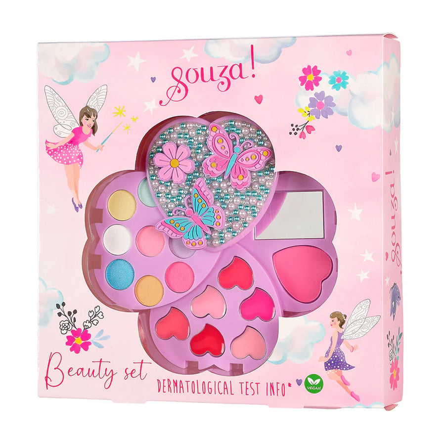 Farver, glimmer og små detaljer, der gør legen ekstra fin. Souza Make-Up Sæt, Beauty er et dekorativt makeupsæt i en smuk æske pyntet med perler, sten, sommerfugle og blomster. Indeni gemmer sig alt, hvad der skal til for at lege salon, prinsesse eller festklar – nemt, kreativt og helt i børnehøjde.