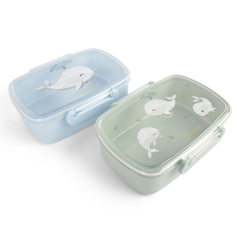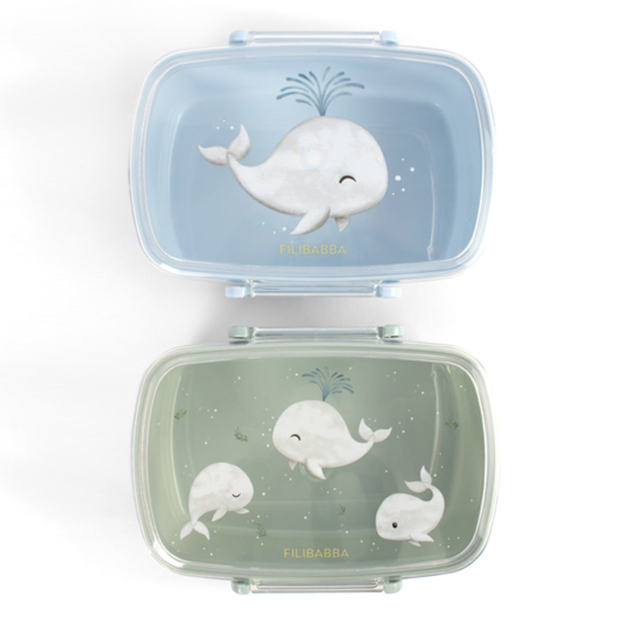 2 praktiske madkasser med sødt hvalmotiv. Nem at åbne, tåler opvaskemaskine og perfekt til hverdagens måltider.