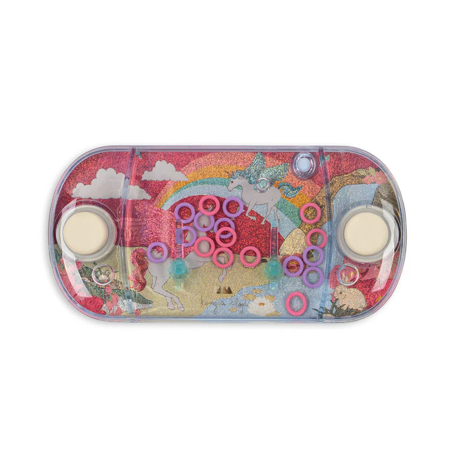 Konges Sløjd Vandspil, Unicorn, er et sjovt og klassisk vandspil, der inviterer til fordybelse og leg. Spillet udfordrer barnet til at trykke på knapperne og styre de farverige ringe hen på de små flydende pinde i vandet.