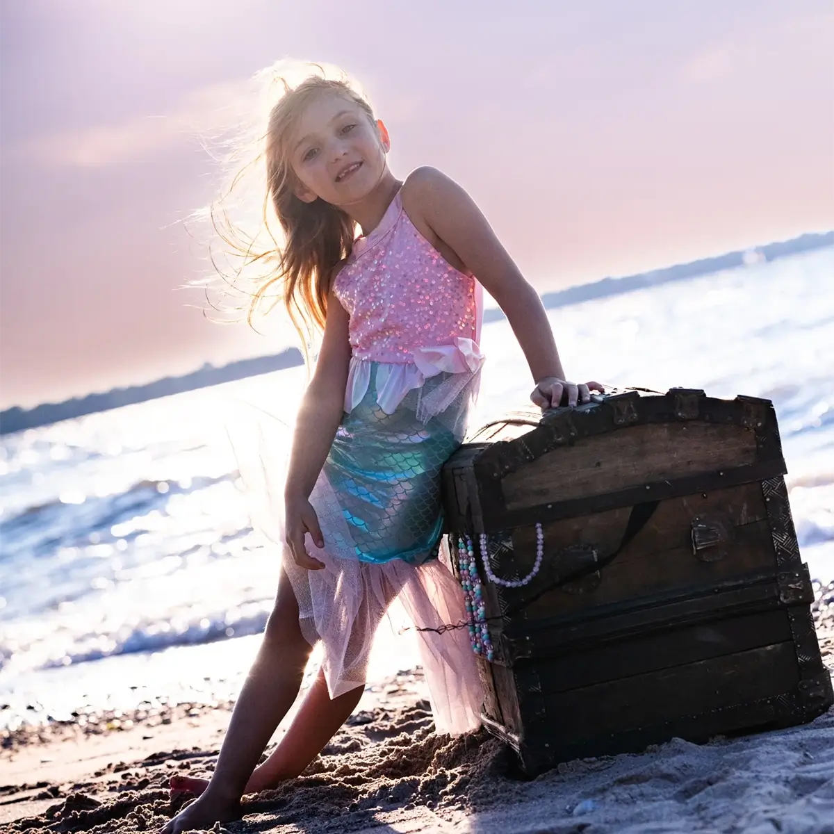 - Havfruedetaljer ved taljen: Det fine muslinge-inspirerede bånd skaber en naturlig overgang til den farverige, havfrueagtige nederdel.