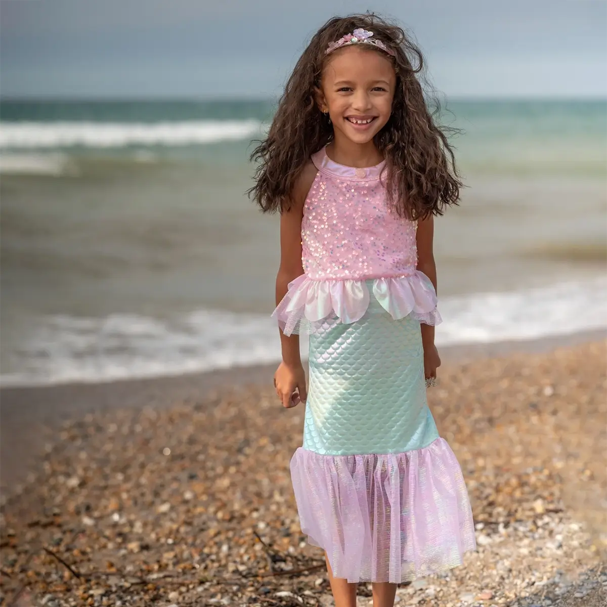 Great Pretenders Misty Havfrue Kjole, Pink er en smuk, glimmerfyldt og legende kjole, der giver barnet mulighed for at dykke ned i et undervandseventyr. En magisk kombination af skælprint, pailletter og tyl, der giver ren havfrueglæde fra første snurretur.