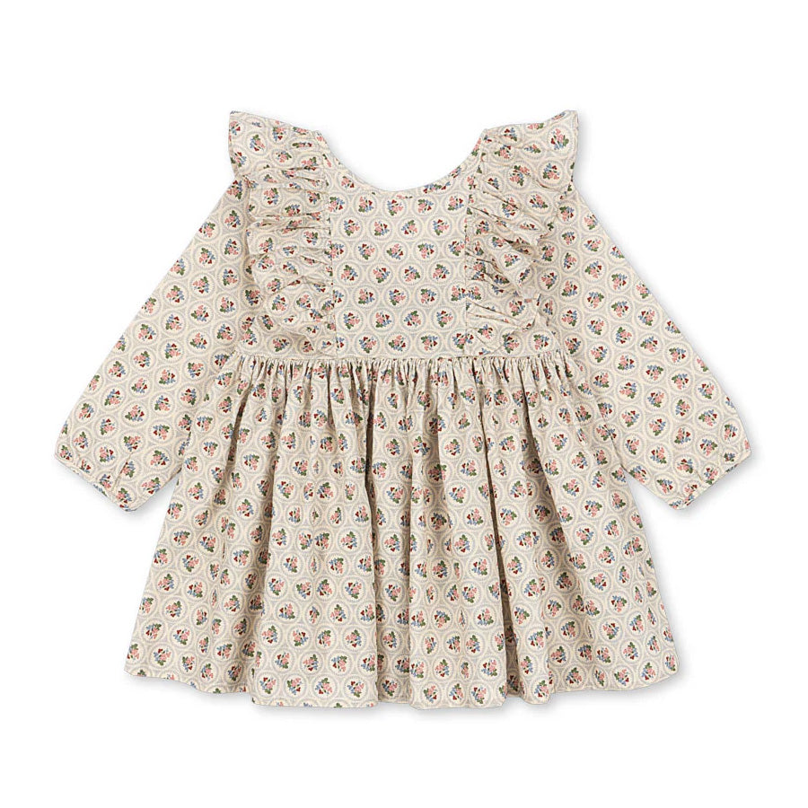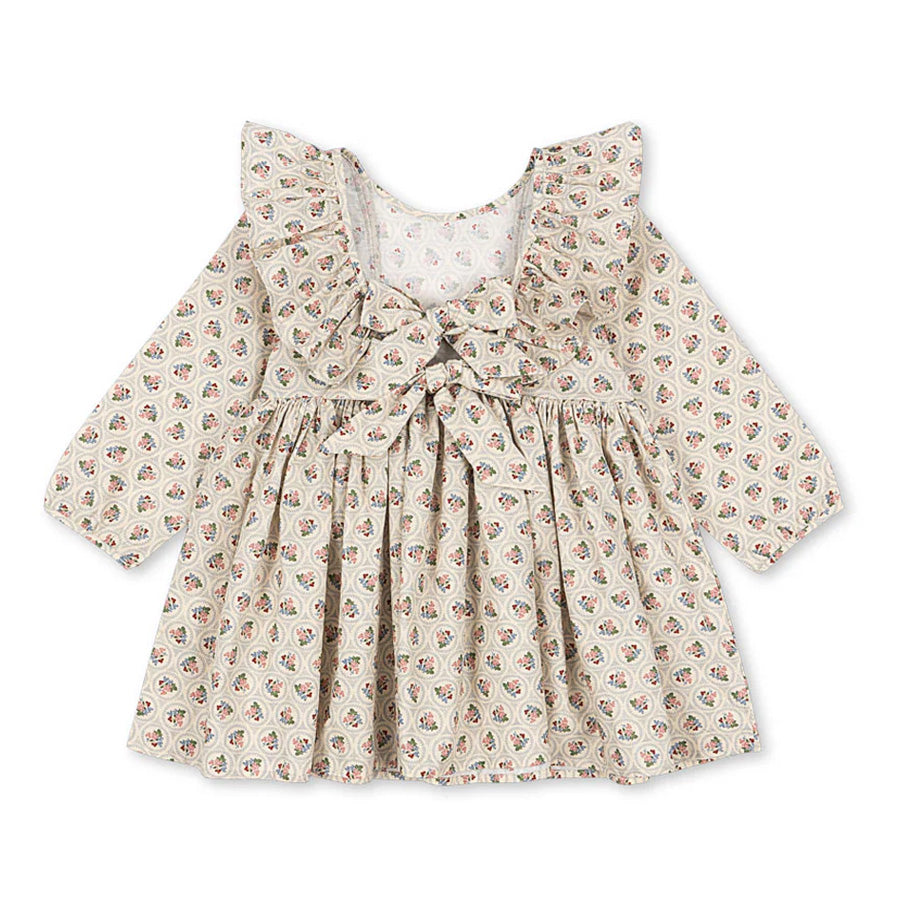 Blød Konges Sløjd Cianna kjole i økologisk bomuld med flæser og sløjfe i ryggen – feminin og komfortabel til hverdag og fest.