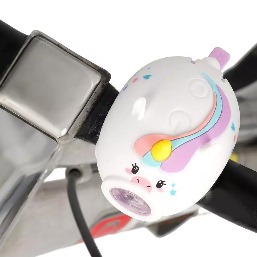 Genopladelig 2-i-1 cykellygte og digital ringeklokke med 3 lysindstillinger, 5 lyde og sødt enhjørningedesign.