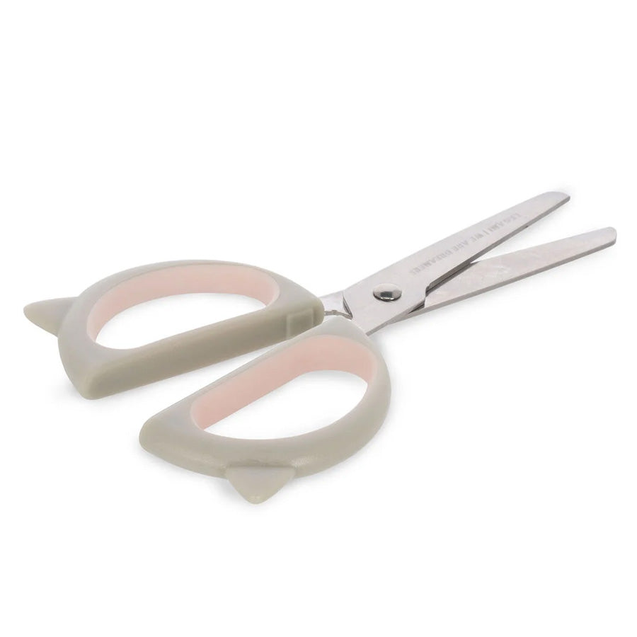 Sikker børnesaks med afrundede spidser, katteformede håndtag og beskyttende hylster – perfekt til små, kreative hænder.