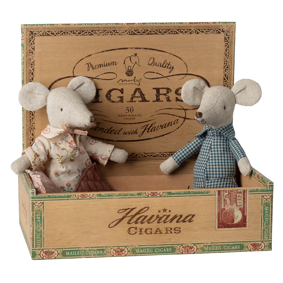 Bedstemor og -Far Mus i Cigaræske fra Maileg – et nostalgisk bedsteforældrepar med nattøj og seng i smuk vintageæske, perfekt til fantasifuld rolleleg.