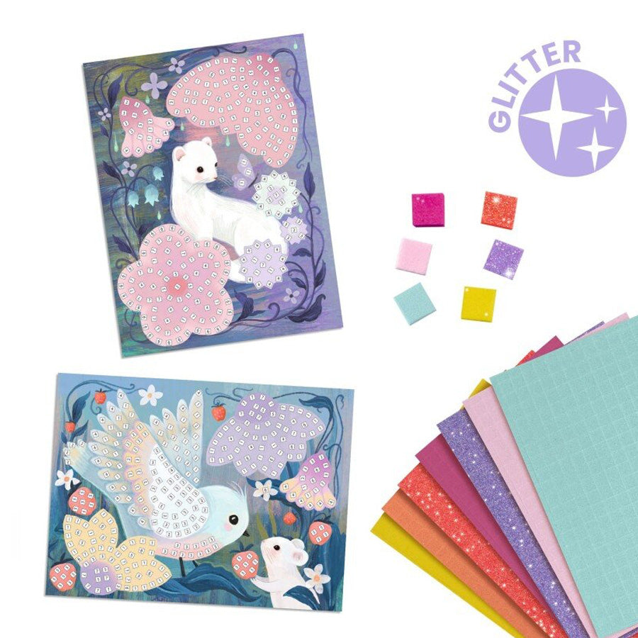 Kreativt mosaiksæt med skovdyr og glitrende stickers. Perfekt til fordybelse og finmotorisk leg for børn.