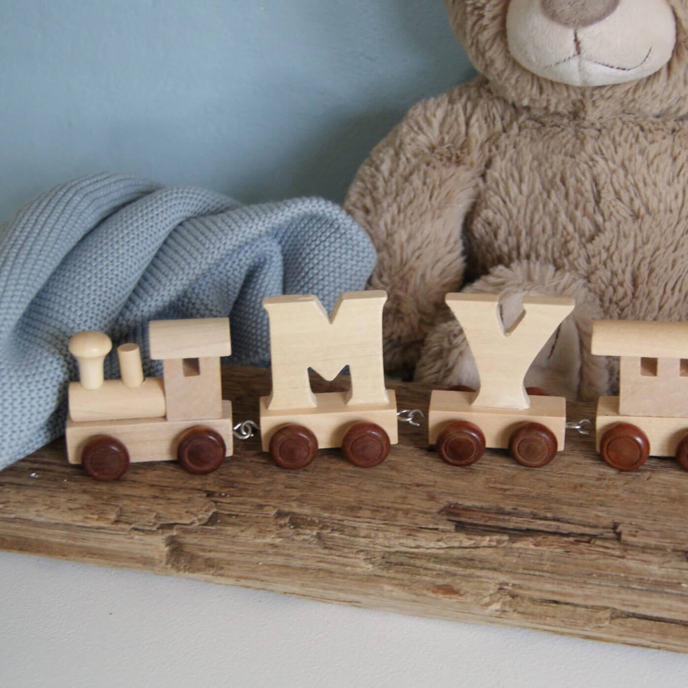Smuk bogstavvogn med bogstavet U i træ til at sætte sammen og danne ord. Togvognen er med krog foran og bagpå, så den kan hægtes til de andre vogne. Sød idé til børneværelset eller fødselsdagsbordet, hvor man kan skrive barnets navn, "TILLYKKE" eller noget helt tredje af de små søde vogne, der sættes sammen.