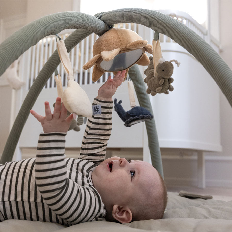 Stimulerer barnets sanser: Lyde, spejl og forskellige former inviterer til udforskning og opdagelse.