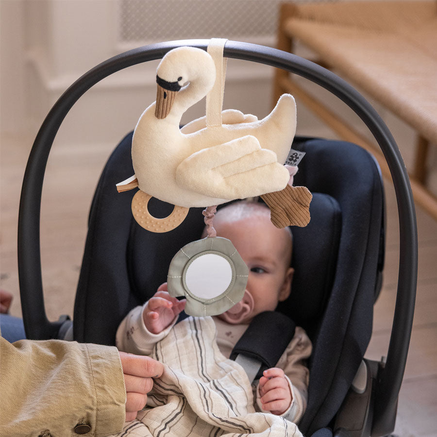 Sebra Multi-aktivitetslegetøj, Svane er et blødt og sansestimulerende aktivitetslegetøj, der inviterer barnet til at udforske, mærke og lege gennem fine detaljer og interaktive elementer.